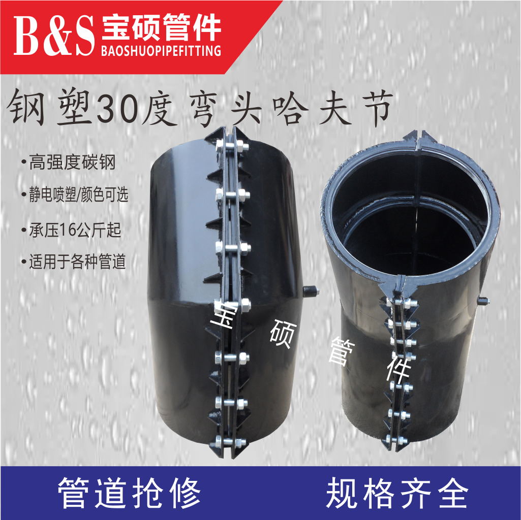 弯头哈夫节用于管道弯头部位出现砂眼、裂缝、断裂的抢修。主要适用于镀锌管、钢管、PE管、PVC管。