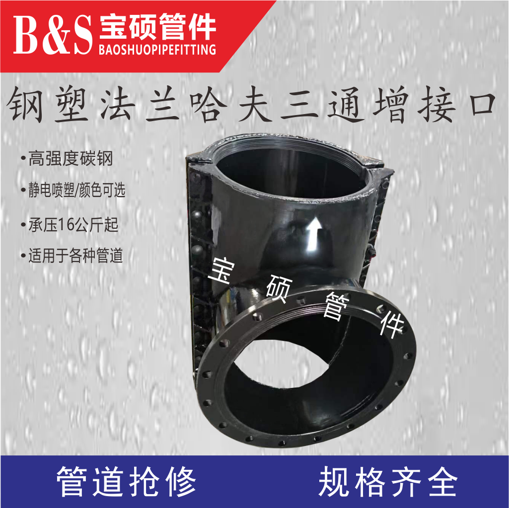总之,钢塑法兰哈夫三通增接口是一种高效、可靠的管道连接件,具有广泛的应用前景。它的使用可以大大缩短管道抢修、维修或改造的时间,降低维修成本,保障管道的正常运行和安全生产。