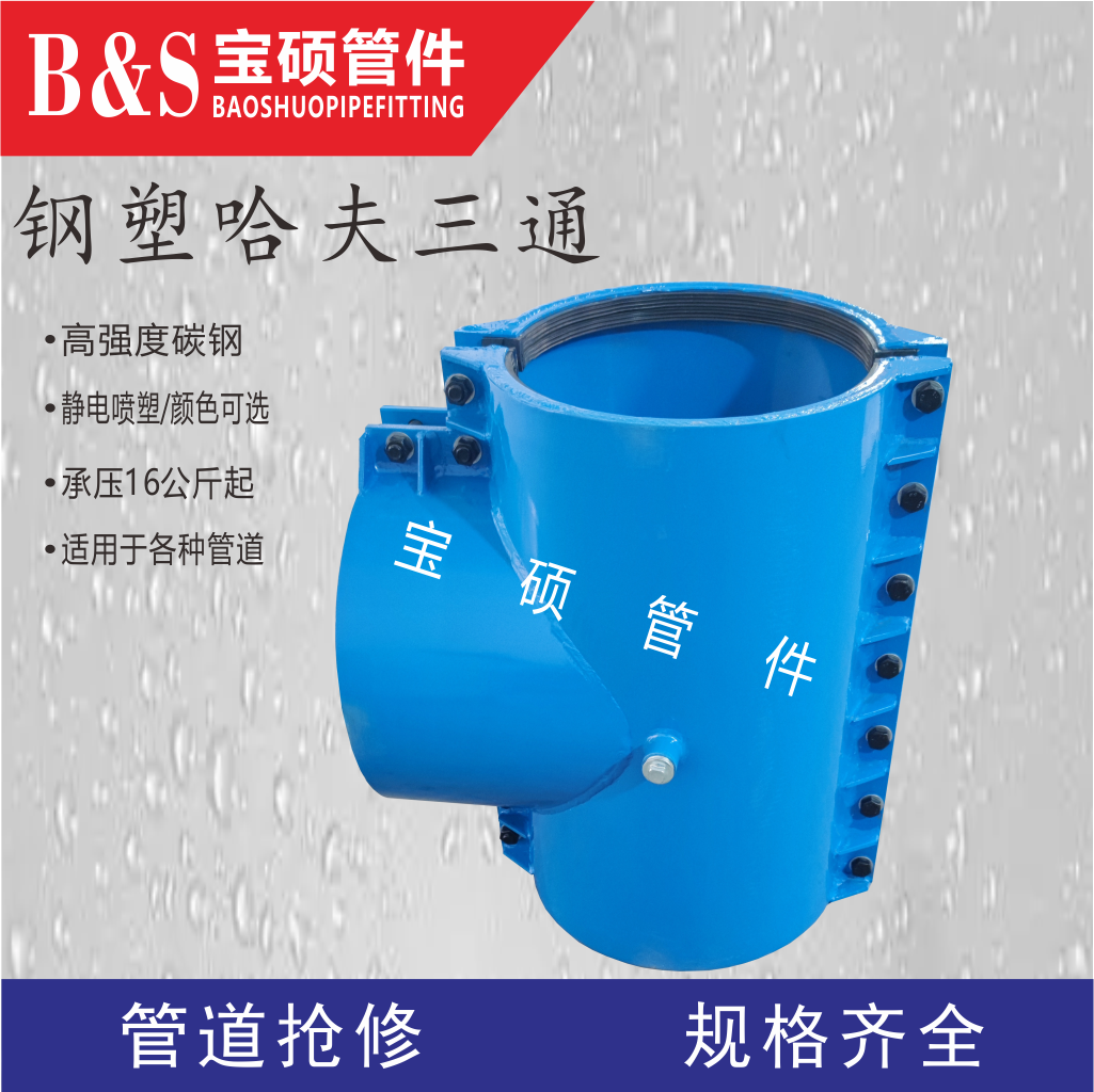 宝硕牌三通哈夫节是一种专门用于管道三通部位(如分支连接处)砂眼、裂缝、断裂等泄漏问题的快速抢修装置