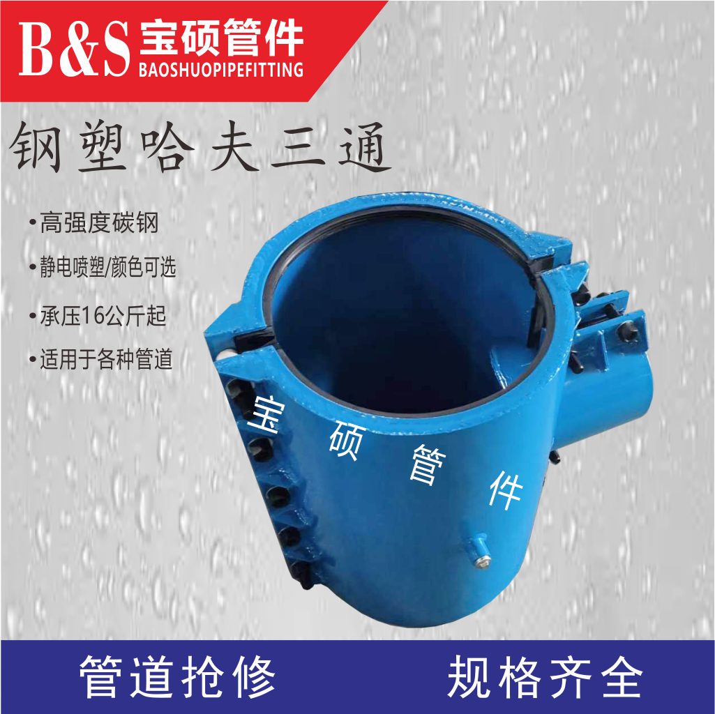 2该.哈夫节使用材质为q235钢表面涂塑处理,钢外涂塑弥补了塑料刚度不高的缺点,同时继承了钢材耐高压,塑料耐腐蚀的特点,比市面上铸铁材质的密封效果更好。可以定制304、316、316L等不同牌号的不锈钢材质。公称压力:≧1.6MPa(2.0MPa -10MPa定做 )