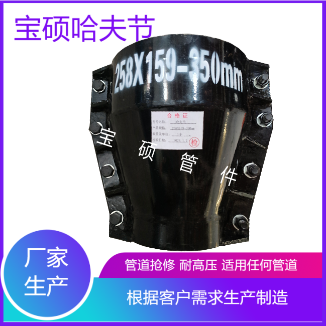 异径哈夫节,也称为大小头哈夫节或异型哈夫节,其特点是一头大,一头小。当渗漏的地方的堵漏管外径不相等的情况下,就可以使用异径哈夫节。