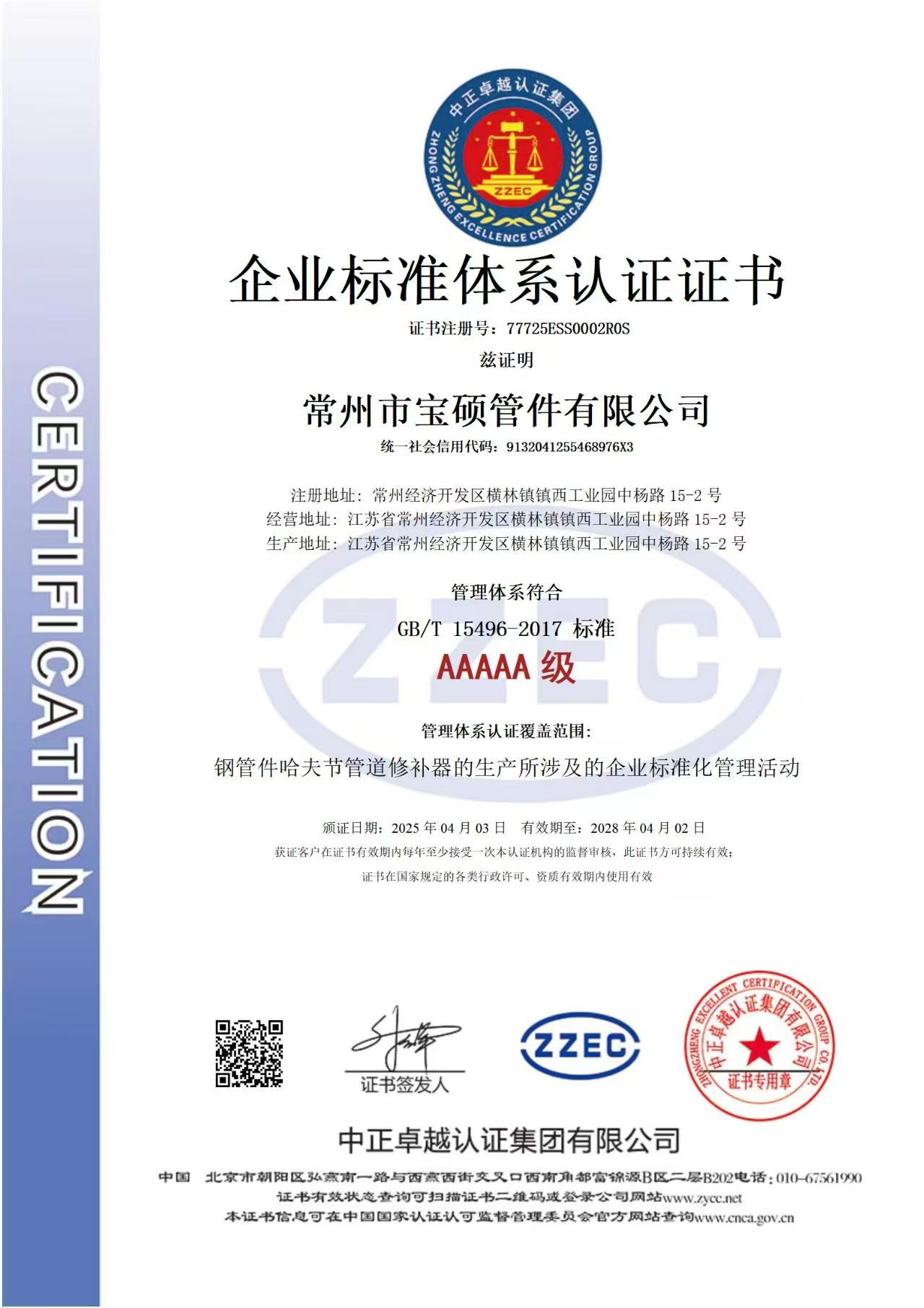 常州市宝硕管件有限公司成功通过GB/T 15496-2017企业标准体系AAAAA级认证——以高标准为客户服务。